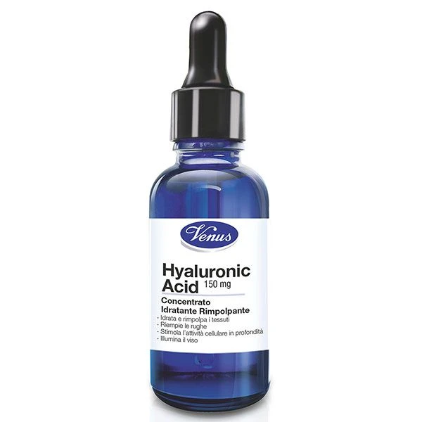 VENUS HYALURONIC ACID CONCENTRATO IDRATANTE RIMPOLPANTE 150 MG : Dalla Ricerca Venus la nuova linea di attivi puri. 10 volte più concentrati di una crema, bastano poche gocce per risultare subito visibili. Veri acceleratori di efficacia. Hyaluronic Acid è un concentrato di Acido Ialuronico purissimo, 150 mg. È indicato quando la pelle è segnata da rughe e segni di disidratazione, priva di tono e compattezza. Utilizzato puro o miscelato alla crema quotidiana idrata intensamente e illumina subito il viso. Infonde idratazione subito e a lungo – Rimpolpa i tessuti – Riempie le rughe – Leviga la pelle